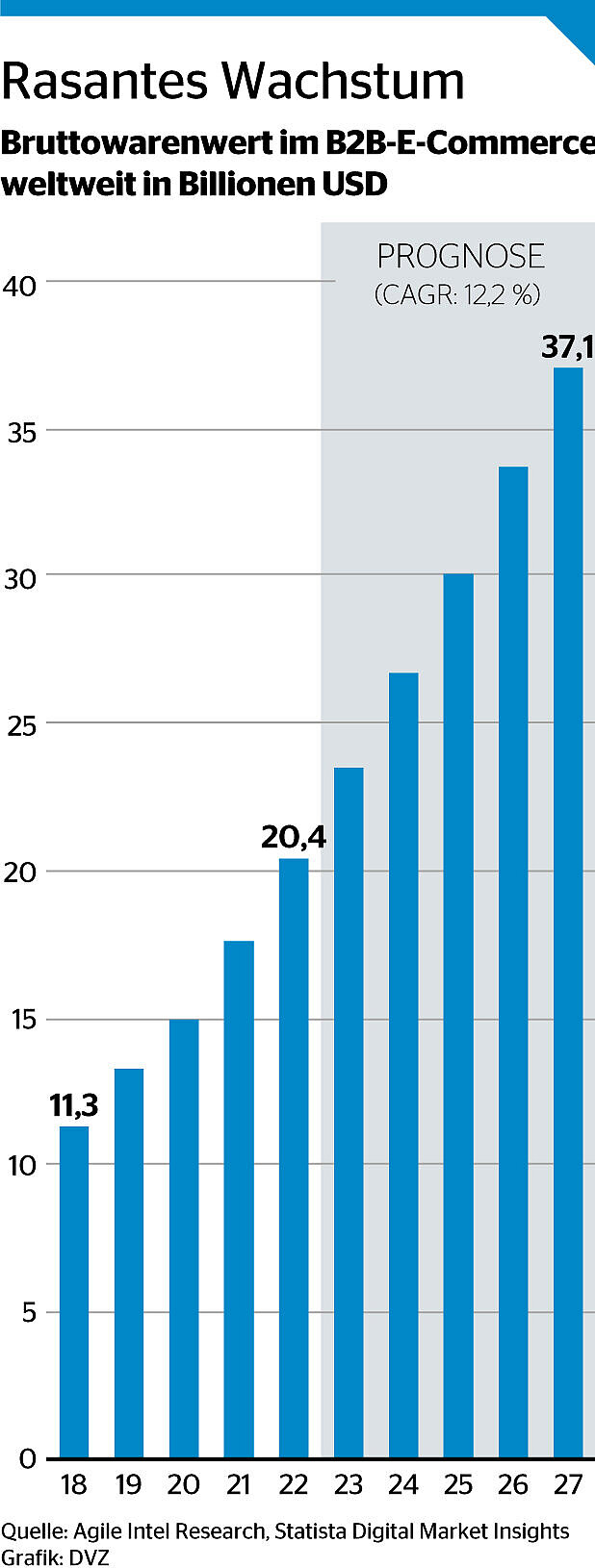 Darüber hinaus hat sich das B2B-Segment im Onlinehandel in der wirtschaftlich angespannten Lage deutlich resilienter gezeigt als das B2C-Segment. Der Bruttowarenwert des globalen B2B-E-Commerce belief sich 2022 schätzungsweise auf 20,4 Billionen Dollar und wird nach einer Prognose von Statista Digital Market Insights und Agile Intel Research bis 2027 auf über 37 Billionen Dollar ansteigen.