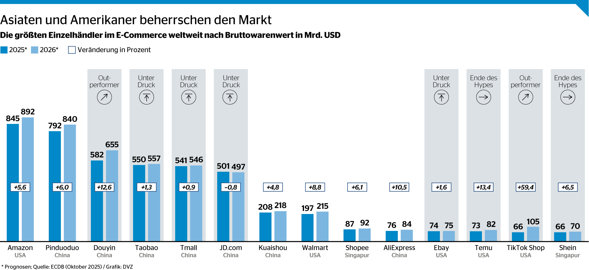 Mit Blick auf die Marktplätze sei indes ein verlangsamtes Wachstum der bisher stark gehypten Plattformen wie Temu zu beobachten. Die höchste Wachstumsprognose wird TikTok Shop und Douyin, dem chinesischen Ableger der Kurzvideo- und Live-Streaming-App, zugesprochen.