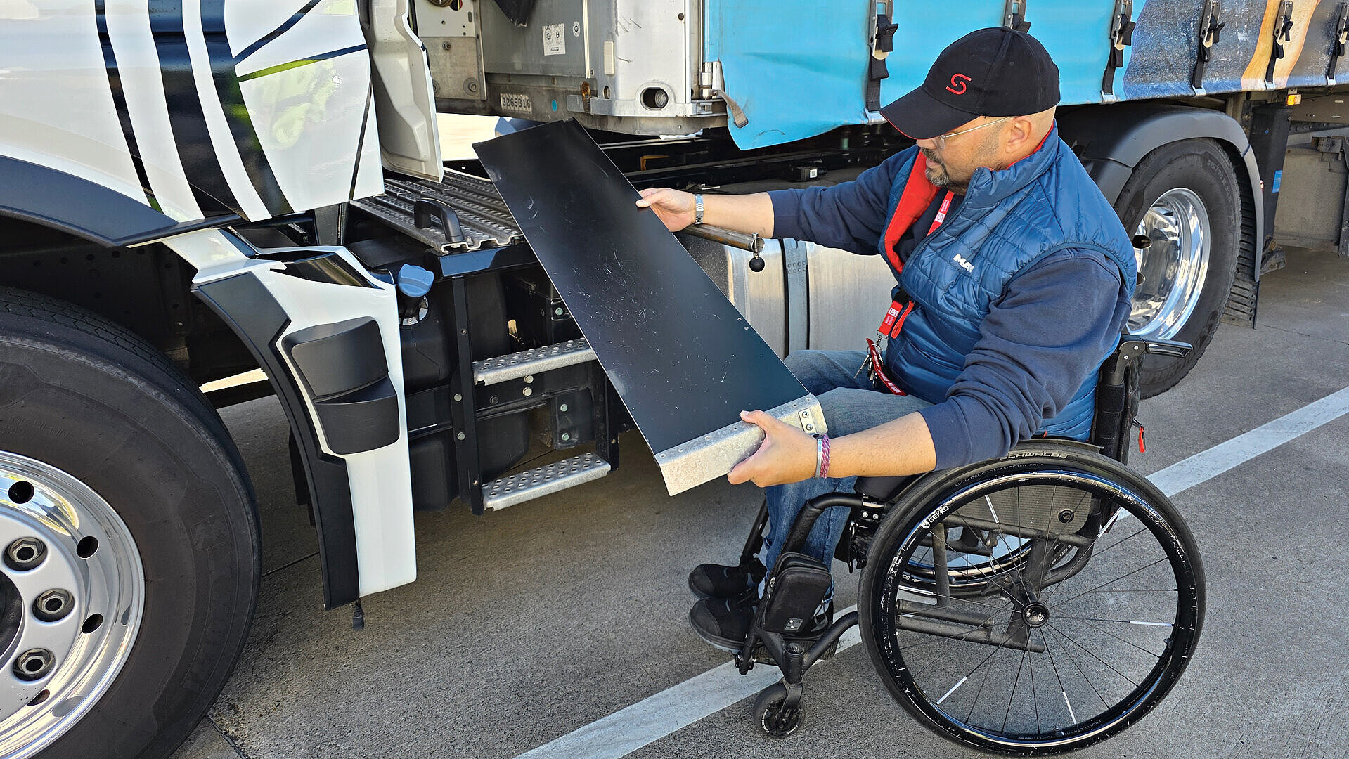 Seit dem Frühjahr 2024 arbeitet Holger Schönenberg nun als Berufskraftfahrer im Bereich Planentransporte für Sievert Logistik am Standort Lengerich. Um das zu ermöglichen, ließ der Transport- und Logistikdienstleister eine Zugmaschine speziell auf seine Bedürfnisse umbauen. Im Detail bedeutet das: eine Handsteuerung für Gas und Bremse, eine verschließbare Kiste für den Rollstuhl, daneben ein herausziehbarer Klappsitz, Haltegriffe, ein abnehmbarer Lift zum Ein- und Aussteigen, damit der Beifahrersitz benutzbar bleibt – und ein Rutschbrett, um selbst an- und abkoppeln zu können.