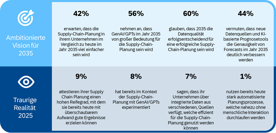 Allerdings: Nicht einmal jedes zehnte Unternehmen stuft seine Planung schon als ausgereift ein. Ebenso experimentieren wenige mit GenAI- oder GPT-Anwendungen im Planungsumfeld. Nur 7 Prozent verfügen über genaue, aus verschiedenen Quellen harmonisierte Planungsdaten. Hochautomatisierte Bedarfsplanung mit minimalem menschlichem Eingriff ist die Ausnahme, ebenso wie Planungssysteme, die klare Handlungsempfehlungen bei Störungen liefern. Diese Diskrepanz verdeutlicht, dass der Weg zu einer wirklich modernen, intelligenten Planung noch lang ist, und gezielte Investitionen, klare Prioritäten und strukturiertes Vorgehen erfordert.